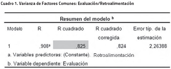 Al elevar el coeficiente de r de Pearson se eleva al cuadrado (r2), se obtiene el coeficiente de determinación lo que indica la varianza de factores comunes, esto es, el porcentaje de la variación de una variable debido a la variación de otra variable; es decir, para la variable "Evaluación" la rP es 0,908 y la r2 es 0,825, consecuentemente la variable "evaluación de los aprendizajes" explica el 82,5% de la variación en la variable "retroalimentación" y viceversa.