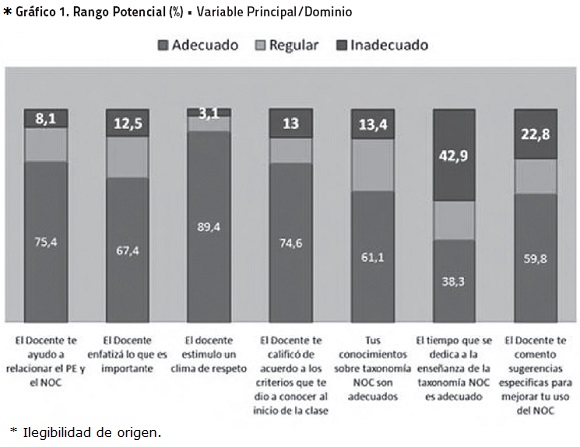 Para interpretar las medidas de tendencia central y la variabilidad, se realizó en su conjunto, mediante la escala de rango potencial, de la cual se interpreto la variable principal de cada dominio del estudio. En el dominio referente al contexto en el aula la variable "relaciones interpersonales" representado por el ítem: el docente estimulo un clima de respeto, el rango potencial se situó en el 89.4% como adecuado, siendo el más alto del estudio. En segundo lugar el dominio referente al docente en su variable "habilidades docentes para la enseñanza" representado por el ítem: el docente te ayudo a relacionar el PE y el NOC, obtuvo un 75.4% como adecuado y finalmente la variable tiempo dedicado a la enseñanza de la taxonomía, correspondiente al dominio del contexto en el aula, representado por el ítem: el tiempo que se dedica a la enseñanza de la taxonomía NOC, sólo el 38.3% lo calificó como adecuado, siendo el más bajo del estudio.