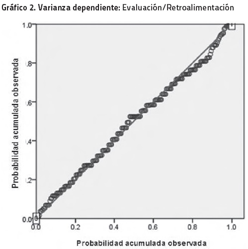 Al establecer el Coeficiente de Correlación de Pearson entre los diversos dominios antes mencionados se logró un rP = .908 con un grado sig. 0.000 entre las dimensiones Evaluación / Retroalimentación lo cual indica que existe una correlación positiva muy fuerte entre estas dos dimensiones del estudio. Esto se verificó al realizar un análisis de regresión lineal simple (gráfico 2); además, con base en el coeficiente de correlación de Pearson se alcanzó el coeficiente de determinación y el resultado de éste nos permite establecer la Varianza de Factores Comunes entre estas dimensiones (cuadro 1).