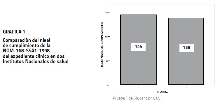 Al comparar el nivel de cumplimiento de la Norma en ambos Institutos, se encontraron diferencias entre ellos (t=3.979, gl=184 y p=0.000). Como puede observarse en la gráfica 1.