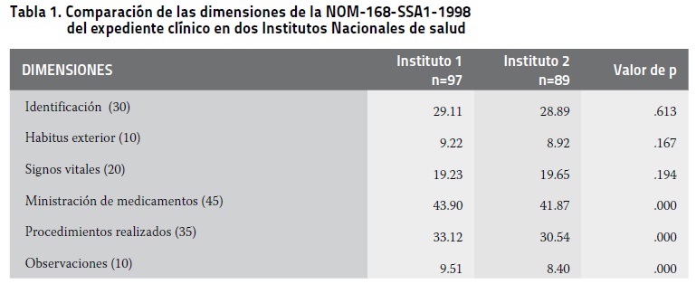 En la Tabla 1 se pueden apreciar los resultados de la comparación del nivel de cumplimiento por dimensiones de la NOM-168-SSA1-1998 del expediente clínico de dos Institutos Nacionales de Salud. Las diferencias existentes son en las dimensiones de Ministración de medicamentos, cuidados de enfermería y observaciones, se aprecia que los promedios más altos corresponden al instituto 1.