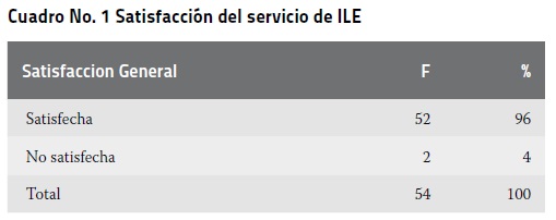 Metodología: Estudio de tipo cuantitativo, descriptivo y transversal. Muestreo por conveniencia conformado por 54 pacientes que acudieron al servicio de ILE.