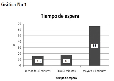 La edad de las mujeres de la muestra osciló entre 15 y hasta 45 años de edad; 30% contaban con una edad entre 15 y 20 años y un porcentaje igual para las mujeres de entre 21 y 25 años, lo que representa que el 60 % se encuentra en una edad considerada como de mayor riesgo para embarazarse por el proceso de madurez en el que se encuentra la mujer. El 59% de esas mujeres se dedicaba al hogar, 21% eran estudiantes y 20% comerciantes. El 41% de las mujeres de la muestra eran solteras, el 35% se encontraba en unión libre y el 17% eran casadas. El nivel de escolaridad con el que contaban era de un 44% para mujeres que cuentan con secundaria, 27% con bachillerato, 16% con universidad. Para 28% de las mujeres encuestadas era su primer embarazo mientras que para el 24% era ya su cuarto embarazo, su segundo embarazo para el 22% y el 20% para las que era su tercer gesta. El tratamiento empleado para la ILE fue en el 64% de los casos de tipo ambulatorio, para el 34% se realizó Aspiración Manual EndoUtrina (AMEU) y solo el 2% con legrado. El 66% de las mujeres del estudio refirieron haber tenido un tiempo de espera mayor a 60 minutos para recibir su tratamiento, el 18% hacen saber que esperaron entre 30 y 60 minutos y solo el 16% refiere haber esperado menos de 30 minutos (Gráfica 1); a pesar de lo anterior el 56% de los casos reporta estar satisfecha con el tiempo de espera mientras que el 44% dice no estar satisfecha por este hecho (Gráfica 2). El 93% de la muestra asistente a ILE reportaron haber recibido información clara y concisa con respecto a su tratamiento y evolución. Así mismo el 93% refiere haber obtenido un trato respetuoso por parte del personal que le atendió, y el 7% dice que no recibió trato respetuoso. El 89% de las mujeres del estudio refieren haber recibido cuidados de enfermería durante su atención y el 11% dice no haberlos recibido. También el 96% dice estar satisfecha con la atención recibida por parte del personal involucrado en la atención recibida en su tratamiento de ILE mientras que el 4% reporta no estar satisfecha (cuadro 1). El 89% asegura haber recibido "buen" trato habiéndosele otorgado la información necesaria para su tratamiento y el 11% lo refiere como un trato "regular". En la evaluación del trato digno con respecto a la relación enfermera - paciente el 89% de las mujeres consideraron que esta relación fue buena, 9% que fue regular y el 2% que fue mala (cuadro 2).