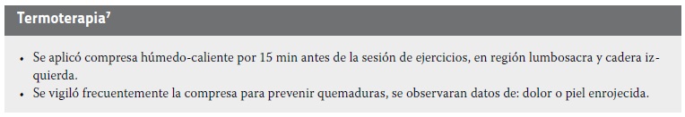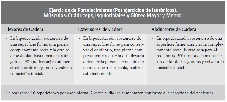 Con los cuidados proporcionados se logró aumentar la fuerza y los arcos de movilidad de la cadera izquierda, lo que permitió mejorar la marcha y la reintegración de la persona a su vida laboral; por lo tanto el objetivo de la rehabilitación fue alcanzado. En este proceso es importante contar con el compromiso de la persona y sus familiares, ya que el avance hacia el logro de los objetivos es en gran medida responsabilidad de ellos.