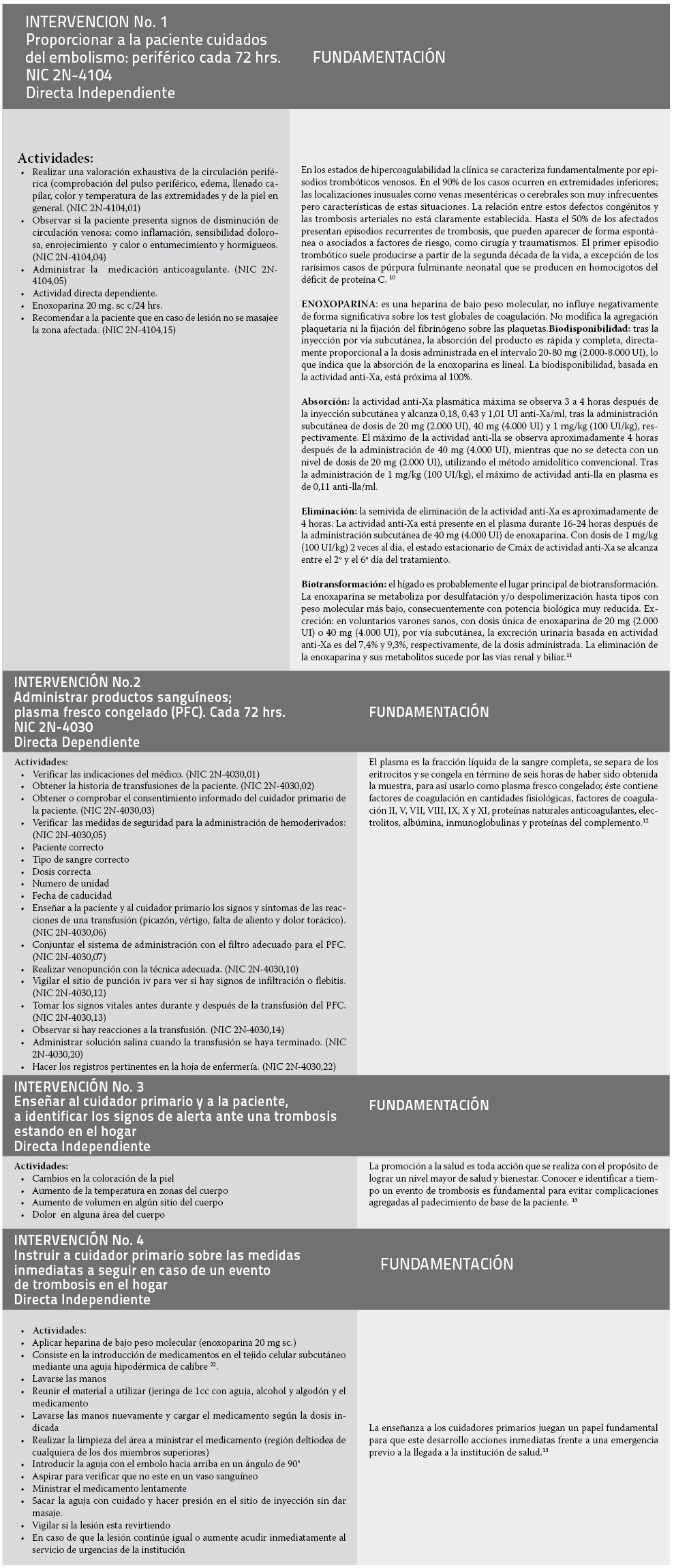 Objetivo: Dar a conocer el estudio de caso, de una adolescente femenina con deficiencia de proteína "C" con dependencia en la necesidad de seguridad y protección. Metodología: Se utilizó el Proceso Atención de Enfermería, orientado con la propuesta filosófica de Virginia Henderson, la recolección de la información se realizó mediante fuentes primarias y secundarias, se realizaron valoraciones focalizadas obteniéndose 15 diagnósticos enfermeros de los cuales 5 están en dependencia, 5 en riesgo y 5 en independencia; la realización de los mismos se hizo apoyándose en la taxonomía de la NANDA versión 2009-2011 y en el formato PES. Se detectó el grado y nivel de dependencia de acuerdo a la escala propuesta por Margot Phaneuf, y se planearon las estrategias a realizar para que ella alcanzara su independencia. Resultados: Con las intervenciones que se propusieron en el plan así como las acciones de enfermería se logró que la paciente y su cuidador primario (mamá) identificaran como enfrentar los problemas principales derivados de la pérdida de la visión y el embolismo de tal forma que se evitaron complicaciones futuras. Cabe mencionar que la participación del cuidador primario fue fundamental para mejorar el nivel de dependencia de las necesidades alteradas.