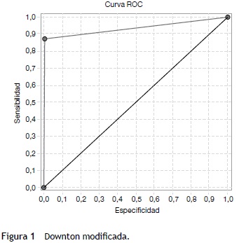 Se calculó la curva ROC, donde el área bajo la curva para el instrumento J. H. Downton modificado fue de 0.93 y el IC del 95% de 0.90-0.95 (fig. 1).