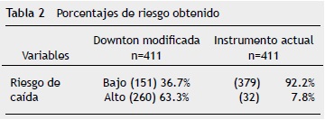 Llama la atención que utilizando la escala J. H. Downton modificada se observa un mayor porcentaje de riesgo alto de caídas en el paciente pediátrico hospitalizado, en comparación con la valoración que se hace con el instrumento actual (tabla 2).
