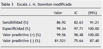 Por medio del programa estadístico Epidat 3.1, se realizaron pruebas de sensibilidad y especificidad, así como valores predictivos positivos y negativos, obteniéndose valores altos para predecir el riesgo de caídas en la escala J. H. Downton modificada (tabla 3).