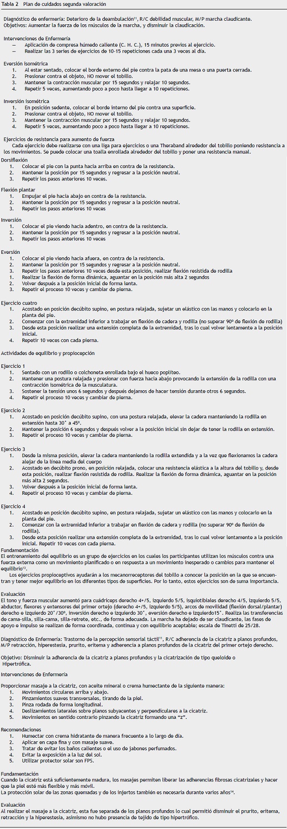 Métodos: Se trata de masculino de 55 años con quemaduras de tercer grado por electricidad en ambas manos y en el primer ortejo derecho. Se realizó una valoración integral de enfermería, utilizando una guía de entrevista, seguida de una exploración física. Se complementó con otras herramientas de valoración como: índice de Barthel, escala de Lawton, Tinetti, Daniels y Crichton. Los diagnósticos de enfermería se formularon utilizando el formato P.E.S.