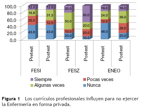 De primera instancia en el cuestionario pretest el mayor porcentaje de los participantes consideraron que el currículo no era un factor que limitaba para ejercer la enfermería en forma privada; sin embargo, posterior al curso este resultado se modifica y si se consideran las respuestas de "algunas veces" más las de "siempre" entonces poco más de la mitad de este grupo considera que el currículo tiene influencia o se relaciona con el no ejercicio libre de la Enfermería.