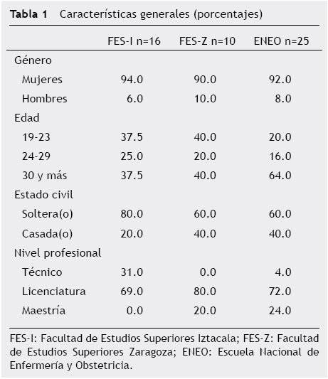 En la tabla 1 se presentan las características generales de las(os) participantes; la muestra se conformó de 4 hombres (8%) y 47 mujeres (92%), teniendo un total de 51 participantes en el curso: 16 de la FES-I, 10 de FES-Z y 25 de la ENEO. Como se observa, la mayoría de las participantes son del sexo femenino lo que constituye históricamente la pertenencia de este género para profesiones del cuidado de los otros, como lo es la carrera de Enfermería9.
