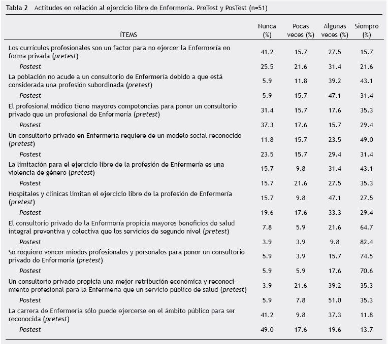 El objetivo de esta investigación fue analizar las actitudes que los profesionales de la enfermería tienen en relación al ejercicio libre de la profesión para instalar y trabajar en un consultorio privado con base en la aplicación de un cuestionario pretest-postest, durante la realización de un taller sobre herramientas teórico-metodológicas con perspectiva de género para el ejercicio libre de la profesión.