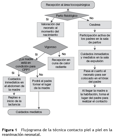 No obstante, se han reportado como desventajas la presencia de eventos adversos ocurridos en la reanimación, los cuales se sustentan en casos clínicos reportados22,30-33. Se señala que aunque estos eventos aparentemente letales en las primeras 2 horas de vida son un suceso poco frecuente, pueden ser graves. Es necesario controlar los factores de riesgo en los que todos coinciden (madre primípara, contacto piel con piel donde los bebes se encontraron en posición prono y madre sola en sala de partos) para evitar aparición de nuevos casos33. Para poder establecer el contacto piel a piel es necesario contestar 3 preguntas principales en el momento del parto ¿embarazo a término?, ¿respira o llora?, ¿tiene buen tono muscular?, de ser así entonces se podrá llevar acabo, se puede secar con una toalla y limpiar con una gasa las secreciones de ser necesario4,34, mientras que las demás maniobras podrán esperar para no romper ese primer vínculo del binomio; cuando no es posible y la madre necesita ser sometida a una intervención quirúrgica, es cuando el padre debe disponerse a realizar esta función35-37, se recomiendan estar en vigilancia estrecha las primeras 2 horas (fig. 1).