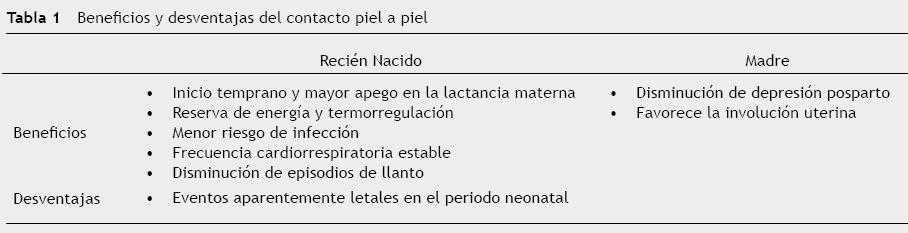Los beneficios y desventajas del contacto temprano piel a piel para el recién nacido y la madre se presentan en forma indicativa en la tabla 1.
