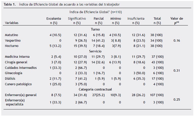Resultados: Se incluyeron un total de 110 observaciones a personal de enfermería que administró hemoderivados. Se obtuvo un índice de eficiencia global parcial (IEG) parcial a excelente de 64.5%. No se encontró asociación en el turno (p=0.16), servicio (p=0.31) y/o categoría contractual (p=0.25). Los porcentajes de excelente en el IEF fueron bajos (por turno: matutino y nocturno de 10 y 13 respectivamente, medicina interna y cirugía general 5 y 7%, y conforme a la categoría contractual, la enfermera general obtuvo en excelente sólo el 7.5%).