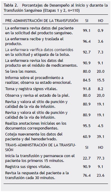 Se realizó un estudio transversal en un Hospital de segundo nivel, en La Paz Baja California Sur, durante el 1º de Enero al 30 de Junio del 2013. Realizamos 110 observaciones, a través de muestreo no probabilístico, el universo de estudio estuvo constituido por enfermeros(as) especialistas, enfermeros generales de base y/o eventuales, de los servicios hospitalarios de Medicina Interna, Cirugía General, Terapia Intermedia, Ginecología-Obstetricia y Diálisis; de los turnos matutino, vespertino y nocturno. No fueron evaluados cuando se administró hemoderivados en situación de urgencias y en el servicio de quirófano, así como en los procesos en los que se realizaba cambio de turno. Los datos se recolectaron con un instrumento estructurado para la evaluación del desempeño de la enfermera que incluye los puntos obligatorios de la NOM- 003-SSA2-1993 de Transfusión de hemoderivados, y se valoró el proceso de transfusión del componente sanguíneo, esto lo establece el programa de evaluación de la calidad de los servicios de enfermería, validado en el Instituto Nacional de Cardiología Ignacio Chávez, cuya variabilidad interobservador tiene un valor de Kappa de 0.8.