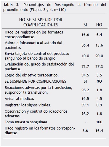 El 94.5% logra el objetivo terapéutico y el 10% envía la tarjeta de control del producto sanguíneo al banco de sangre. El 99.1% registra signos vitales al suspenderse la transfusión por complicaciones y ninguno tomó muestra sanguínea (tabla 3).