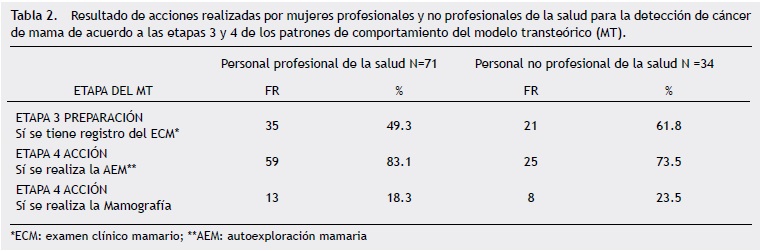 En relación a los patrones de comportamiento del MT, en la tabla 2 se resaltan en las etapas 3 y 4 las 3 acciones consideradas para la detección oportuna para cáncer de mama: 1) autoexploración mamaria, 2) examen clínico mamario y 3) mamografía (de acuerdo a la edad de la participante). La que se realiza con mayor frecuencia es la autoexploración mamaria.