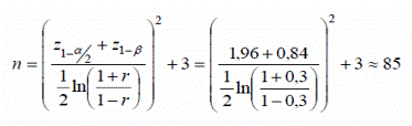 El coeficiente de asociación establecido fue de 0.3 (r= 0.3), tomando como referencia un estudio de Gómez Palencia y Durán de Villalobos15. La significación o riesgo de cometer un error de tipo I fue del 5% (α = 0.05) y el poder estadístico 1−β fue del 80% (riesgo de cometer un error de tipo II del 20%).