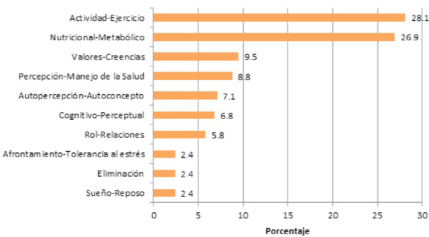 Los patrones funcionales de mayor afección fue el patrón 4, Actividad-Ejercicio (28.1%), seguido de Nutricional-Metabólico correspondiente al patrón número 2 (26.9 %) y el patrón número 11, Valores-Creencias (9.5 %). (Figura 2).