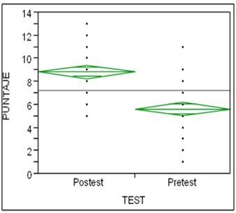 El postest se aplicó tres semanas después de realizar la simulación; la gráfica 2 nos muestra la diferencia de medias entre el pretest y el postest de quienes recibieron el tema con la metodología tradicional; se observa una diferencia estadísticamente significativa (p <.001) entre los puntajes obtenidos en ambas evaluaciones.