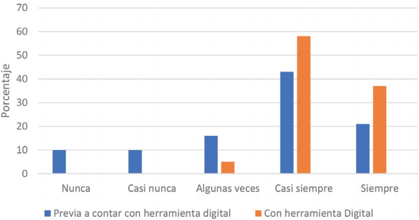 6, 7. Frecuencia de aplicación del PLACE en pacientes con TB: Se indagó la frecuencia de su utilización antes de contar con la aplicación digital y posterior a tenerla; 64% dijo casi siempre o siempre aplicar el PLACE en TB (por medios tradicionales) mientras que, posterior al uso del SE el 95%, dijo casi siempre o siempre aplicar el PLACE en TB (con el SE). Simultáneamente, 20% dijo nunca o casi nunca aplicar el PLACE en TB antes de tener el SE, mientras que, al contar con él, la categoría de nunca o casi nunca fue 0%. (Gráfica 1).