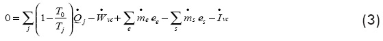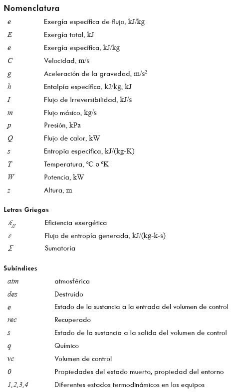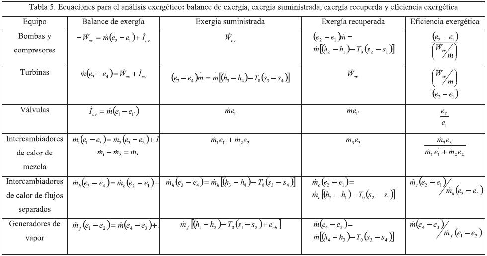 El modelo matemático está compuesto por las ecuaciones de la primera y la segunda ley de la termodinámica, la ecuación de balance de la exergía y la ecuación de eficiencia exergética (Lior y Zhang, 2007), indicadas como ecuaciones (1) a (4).