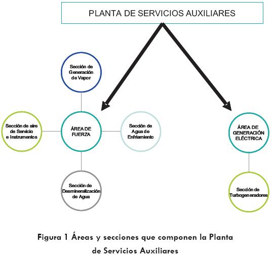 En la figura 1 se presenta el diagrama de las áreas y las secciones que componen la Planta de Servicios Auxiliares. Las áreas son dos: la de fuerza y la de generación eléctrica. El área de fuerza está compuesta por las secciones de generación de vapor, de desmineralización de agua, de enfriamiento de agua y de aire de servicio e instrumentos. El área de generación eléctrica está compuesta por la sección de turbogeneradores. La descripción de cada una de estas áreas se presenta a continuación.