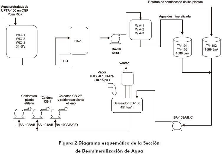 El agua desmineralizada es depositada en dos tanques de almacenamiento (TV-101 y TV-103) con capacidad de 1589.8 m3 cada uno. El condensado que retorna de las plantas se almacena en el tanque TV-102 y se mezcla con el agua desmineralizada para alimentar al deaereador ED-100 y suministrarse a los generadores de vapor, CB1, CB-2, CB-3 y a las calderetas de la Planta de Etileno.