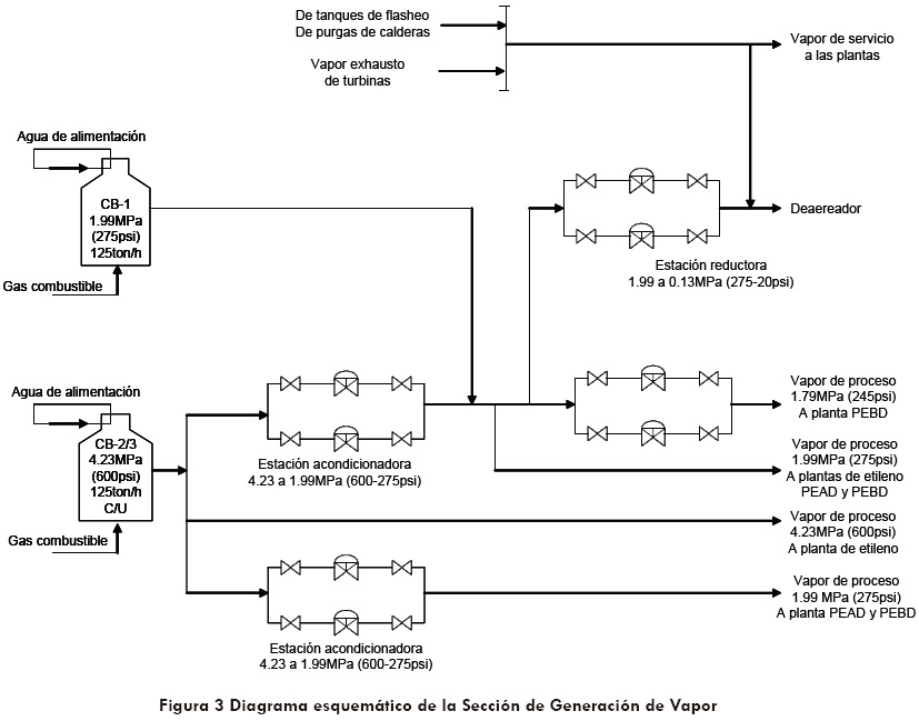 El vapor sobrecalentado de alta presión a 4.23 MPa y 400ºC se produce en los generadores de vapor CB-2 ó CB-3 y se suministra en forma directa a la planta de etileno para su utilización en las turbinas.