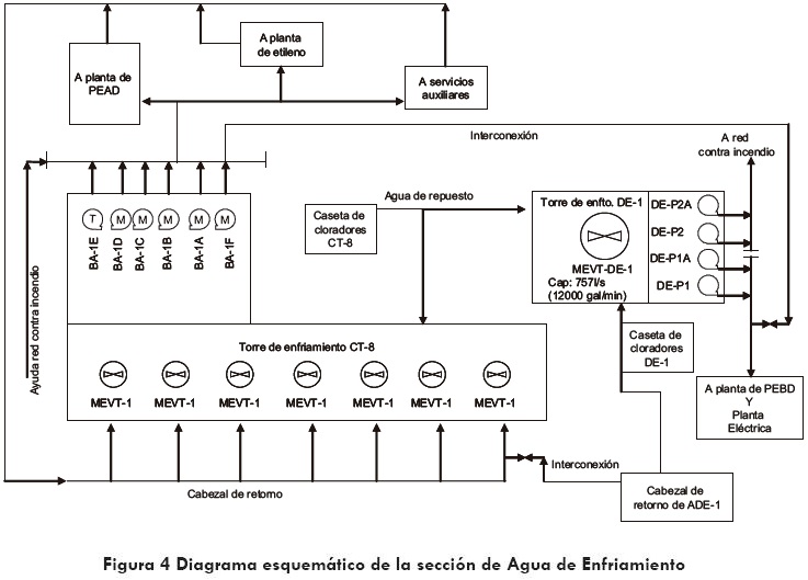 La sección de agua de enfriamiento está compuesta por dos torres de enfriamiento (DE-1 y CT-8). La torre de enfriamiento DE-1 con capacidad de 757 l/s, suministra agua de enfriamiento a la Planta de PEBD y la torre de enfriamiento CT-8, con capacidad de 5047 l/s, proporciona agua de enfriamiento a las Plantas de Etileno, a la PEAD y a la Planta de Servicios Auxiliares. La figura 4 sirve para presentar el diagrama esquemático de esta sección.