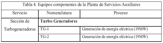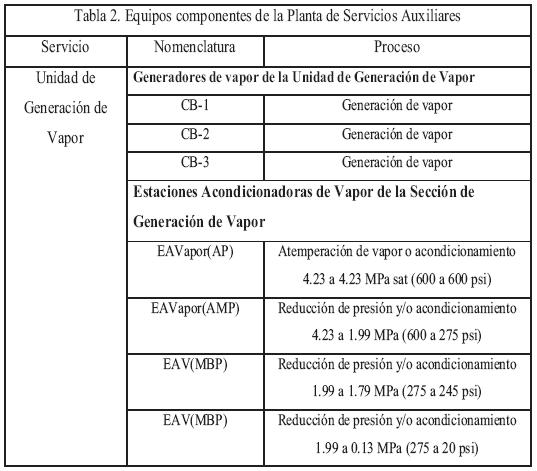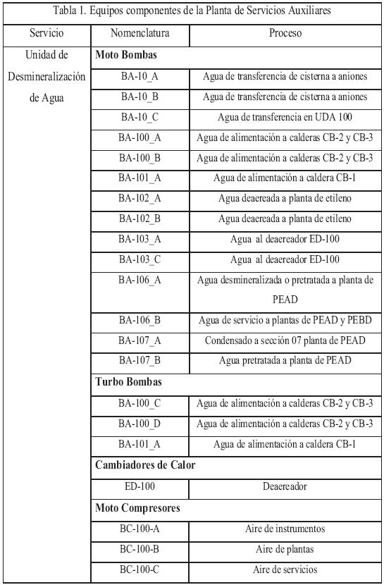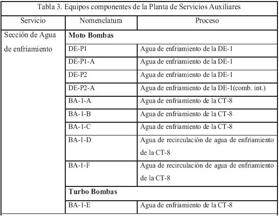 Los equipos analizados en este trabajo son los que integran la planta de servicios auxiliares y se enlistan en las tablas 1 a 4. (2, 3).