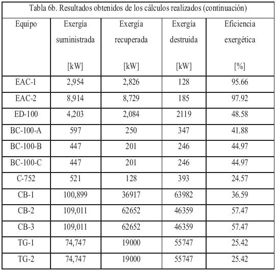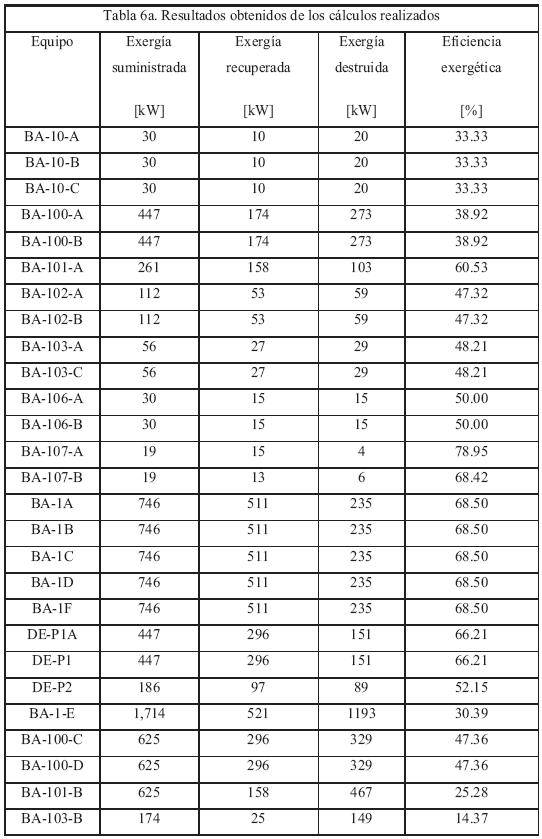 A partir de las ecuaciones de la tabla 5 para cada uno de los equipos analizados, se planteó el balance de exergía y se calcularon la exergía suministrada, la exergía recuperada, y la eficiencia exergética. Los resultados se muestran en las tablas 6a y 6b, en donde se incluye la exergía destruida.