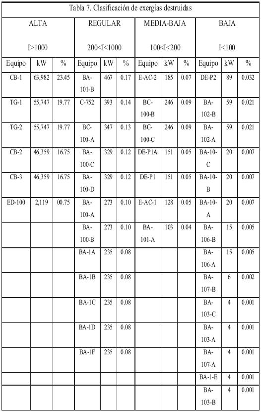 En consecuencia, la eficiencia exergética total es de 44.27 %. Para completar el análisis exergético, las exergías destruidas se han clasificado en cuatro categorías, de acuerdo a sus magnitudes, como se muestra en la tabla 7.