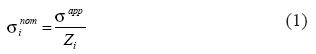 where σapp is the applied stress, σinom is the distribution of the nominal stress ahead of the notch root as a function of the distance from the notch i, mapped as i=2a/D, and Zi is the notch factor given by,