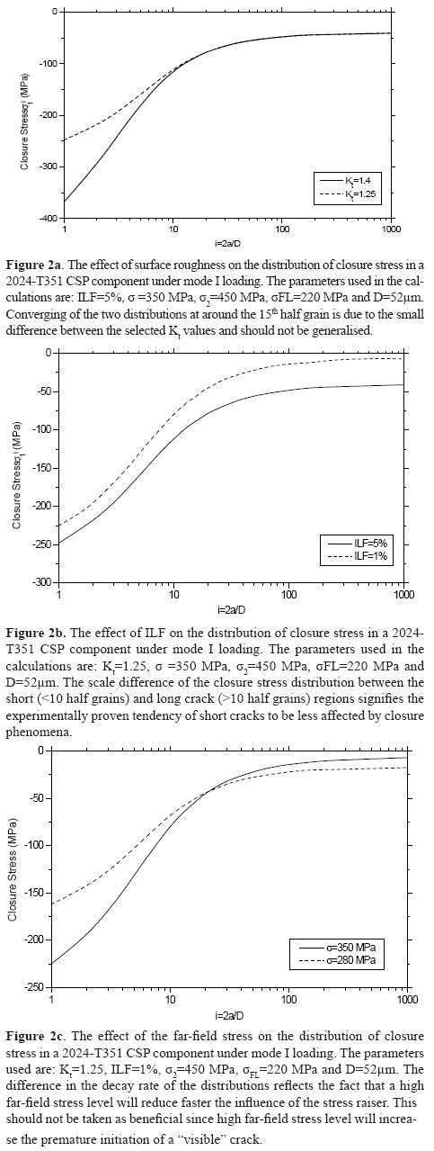 The introduction of a predetermine improvement in terms of fatigue life (ILF) has been achieved by introducing the ILF into the number of fatigue cycles consumed in every grain. The above approach allows the mathematical modelling of the conflict between the beneficial and detrimental CSP effects. At first the analysis reveals that the magnitude of the closure stresses should always attain a maximum at the surface. Such distribution minimises the premature initiation of a "visible" fatigue crack. Secondly, the depth distribution should be able to follow the stress gradient generated by the surface roughness. Further analysis allows to scrutinise against parameters like the far-field stress level, the ILF and the surface roughness. From Figure 2, the effect of the above parameter is classified in the following order, starting from the most decisive: a) Surface Roughness. The analysis reveals that a 12% increase, measured in terms of Kt, in the surface roughness requires a 47% increase in the closure stress magnitude to allow a 5% increase in the per grain life. Additionally, a higher Kt would require deeper closure stresses; b) Far-Field Stress Level. In principle high far-field stress levels require high magnitude and deeper closure stresses. This comes as a verification to the fact, published extensively in the literature, that CSP will have a minimum effect, or in some cases a detrimental effect, on the low cycle fatigue region; and c) ILF. The analysis reveals that CSP components are not so sensitive to different ILF values. The above finding is in accordance to many experimental data where short cracks were found to propagate almost irrespective of the crack closure stress levels.