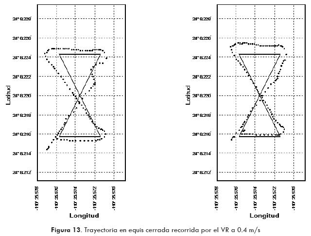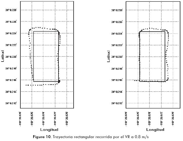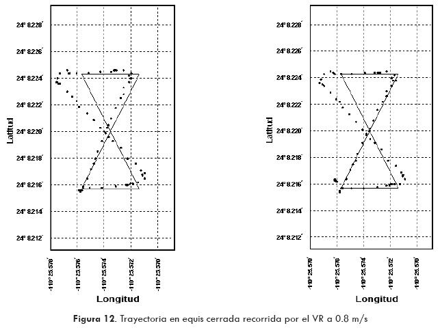 A partir de la información de cada punto, el VR calcula el ángulo de la dirección de las llantas y la velocidad para los motores de tracción. El control de dirección se efectúa con base en la orientación de salida del compás para estimar el ángulo de la dirección de la llanta. La velocidad se estima con base en el conteo de los pulsos generados por el codificador óptico incremental, con relación al movimiento de las llantas. El control de la velocidad se encuentra entre 0.04 y 1.5 m/s, para poder registrar suficientes datos de GPS, con el objetivo de tener una trayectoria definida por un dato por metro.