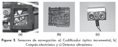 El vehículo cuenta con diversos sensores para navegación y control (Everett, 1995), los cuales son seleccionados de acuerdo a las especificaciones de la tarea a desarrollar. Para efectuar el recorrido sistemático, el vehículo se equipó con tres sensores: un codificador óptico incremental, un compás electrónico (magnetómetro) y un detector ultrasónico empleado como sodar (Fig. 3).
