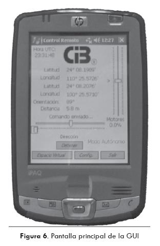 Se programa una interfaz gráfica de usuario (GUI), con la finalidad de simplificar la generación de comandos de control para el VR (Fig. 6). Se implementa, además, una bitácora donde se registra en forma de lista la fecha y hora de los comandos enviados. Se genera un archivo de texto en el que se agrega una línea por cada suceso, y un archivo más es generado para registrar los datos provenientes del VR, como son las lecturas de los sensores y de los GPS para su análisis posterior, estos datos se presentan en la GUI en tiempo real.
