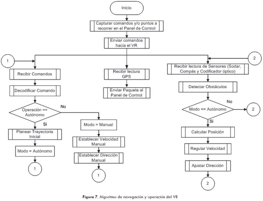 El VR puede ser operado para efectuar recorridos por medio de un algoritmo de navegación (Fig. 7) de dos maneras diferentes: autónoma y manual. Por medio del panel de control se selecciona el modo de operación, y es posible cambiar de un modo al otro en cualquier momento. Cuenta con la función de detección de obstáculos.