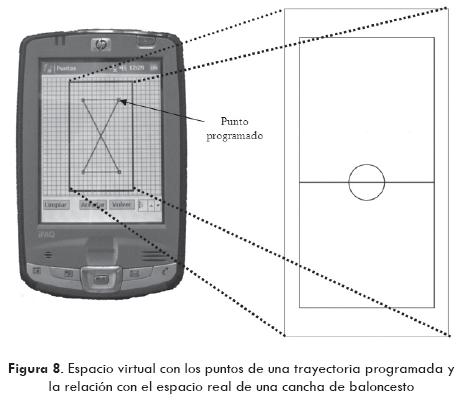 En la PDA se genera un espacio virtual, que representa la zona de trabajo del VR, donde se establece el recorrido que consiste en dos o más puntos seleccionados por medio del lápiz (Fig. 8). Para ir de un punto a otro, se requiere conocer la distancia entre los puntos, además de la orientación de la recta que los une, ambos parámetros son calculados por la GUI de manera automática. Esta información es enviada al VR, el cual toma el control e inicia las acciones necesarias para recorrer la trayectoria al primer punto destino, gira hasta posicionarse en la orientación correcta al punto, y cuando encuentra la orientación correcta, avanza en línea recta hasta recorrer la distancia correspondiente. De manera similar se recorre el resto de los puntos marcados.