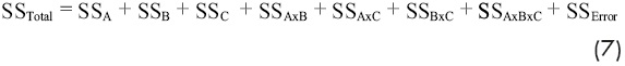 Cada una de esas contribuciones se evalúa por separado, y el valor obtenido del cálculo de su suma de cuadrados es proporcional a la variación que se introduce sobre la media de los cambios de nivel que experimentan los factores. En las ecuaciones siguientes se muestra como se realizan los cálculos de las correspondientes sumas de cuadrados: