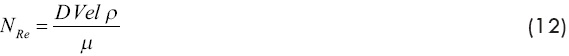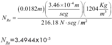 Donde D es el diametro del ducto, Vel es la velocidad del flujo, p es la densidad del fluido y μ es la viscocidad. Sustituyendo los valores se obtiene:
