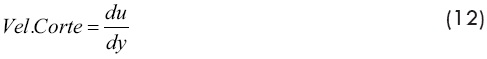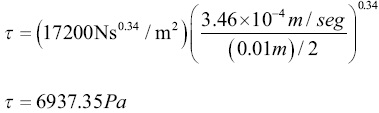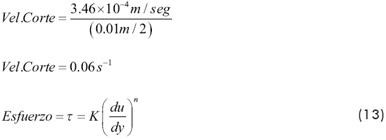 Una vez obtenida las dimensiones, es necesario estimar la velocidad y esfuerzo de cizalla o corte sustituyendo los parámetros reológicos del material de la Tabla 1 en las ecuaciones (12) y (1 3) respectivamente.