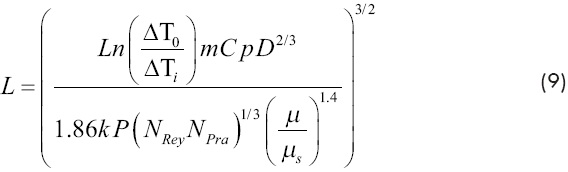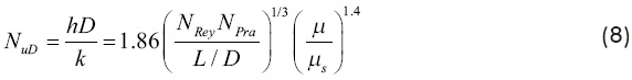 La ecuación (7) describe la transferencia de calor por convección de un fluido a través de un ducto con cierto flujo másico. Debido a que la constante de convección h varía dependiendo de la geometría del cocedor, es necesario utilizar una correlación con un número de Nusselt. Puesto que la harina nixtamalizada es un fluido pseudoplástico y se pretende tener un flujo laminar dentro de un ducto, se propone el Nusselt para fluidos no-newtonianos con viscosidad variable, Sieder E.N., Tate C.E. (1936), como se muestra a continuación: