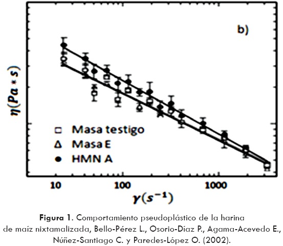 En el caso de la harina nixtamalizada, por ser un fluido pseudoplástico, Figura 1, la viscosidad dinámica disminuye conforme la velocidad de corte aumenta. Valores de viscosidad bajos producen una masa de mala calidad para producir tortillas. Este fenómeno ocurre cuando el material es transportado dentro del tornillo al mismo tiempo que se está cociendo, Figura 2. Estos cambios reológicos provocan que el material sea difícil de procesar (troquelar) en las máquinas tortilladoras. Por esta razón, la extrusión no ha podido sustituir al proceso tradicional en la producción de masa de maíz nixtamalizada para elaborar tortillas. Sin embargo, la extrusión tiene grandes ventajas, siendo éstas: es ecológico, porque solo utiliza el agua necesaria; es más eficiente energéticamente en comparación con el método tradicional que utiliza gas; y disminuye significativamente el tiempo de procesamiento.