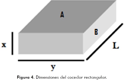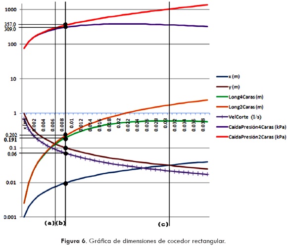 Por cuestión de fabricación, se seleccionó la línea (b), ya que las dimensiones de x,y y la longitud son valores cerrados de x=0.01 m,y=0.1 m y una longitud de 0.2 m. Además, en esta línea, la longitud y la presión no se ven afectadas significativamente si el calentamiento ocurre en dos o las cuatro superficies. Otro aspecto favorable en esta línea es la velocidad de corte, la cual es menor que en la línea (a). Por estas razones, el cocedor se dimensiona de acuerdo a esta selección.