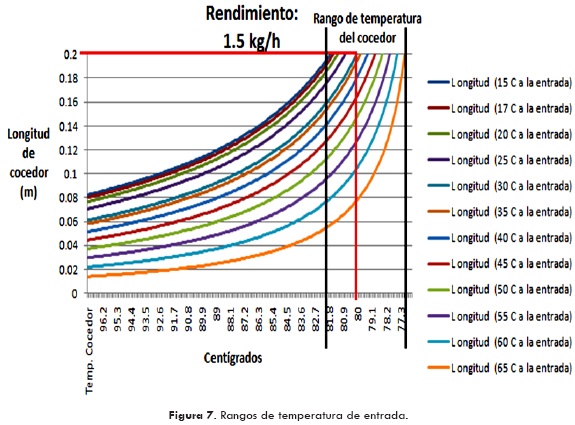 El rendimiento propuesto para el diseño del cocedor es de 1.5 kg/h. y un área transversal de 0.001 m2 como se muestra en la Tabla 4.