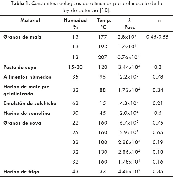 Para realizar la modelación del diseño, es necesario determinar las especificaciones de la máquina. Así mismo, es importante conocer el material a procesar para determinar el modo y rangos de operación. En la Tabla 1, se muestran las características reológicas del material a procesar, Harper Judson M. (1981) (Harina de maíz) y en la Tabla 2, se muestran las temperaturas de gelatinización de la harina de maíz. La transferencia de calor en el cocedor es regida por las constantes termodinámicas del material listadas en la Tabla 3.