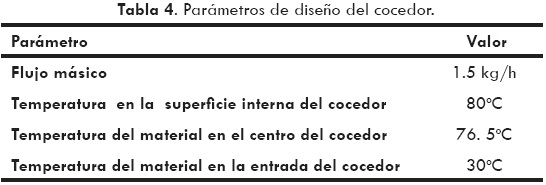 De acuerdo a la información anterior, se concluye que la temperatura del material a la salida del cocedor debe de estar en el rango de 70 °C a 78 °C. Además, la temperatura de las paredes del cocedor no debe sobrepasar los 100 °C, ya que la humedad del material se puede evaporar y formar bolsas de vapor dentro del cocedor.